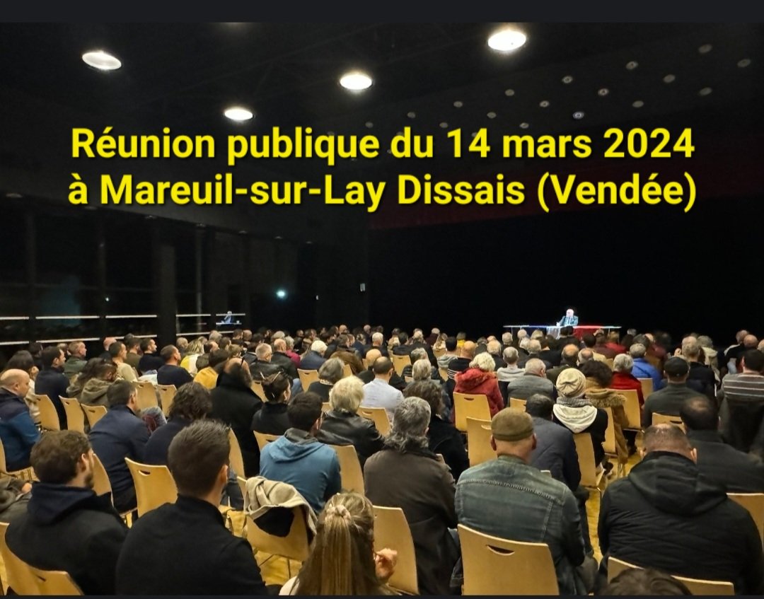 Les jours se suivent et se ressemblent : après la salle comble de 200 personnes à Limoges le 13 mars, nous avons obtenu une audience encore meilleure de 210 personnes le 14 au soir à Mareuil-sur-Lay Dissais.