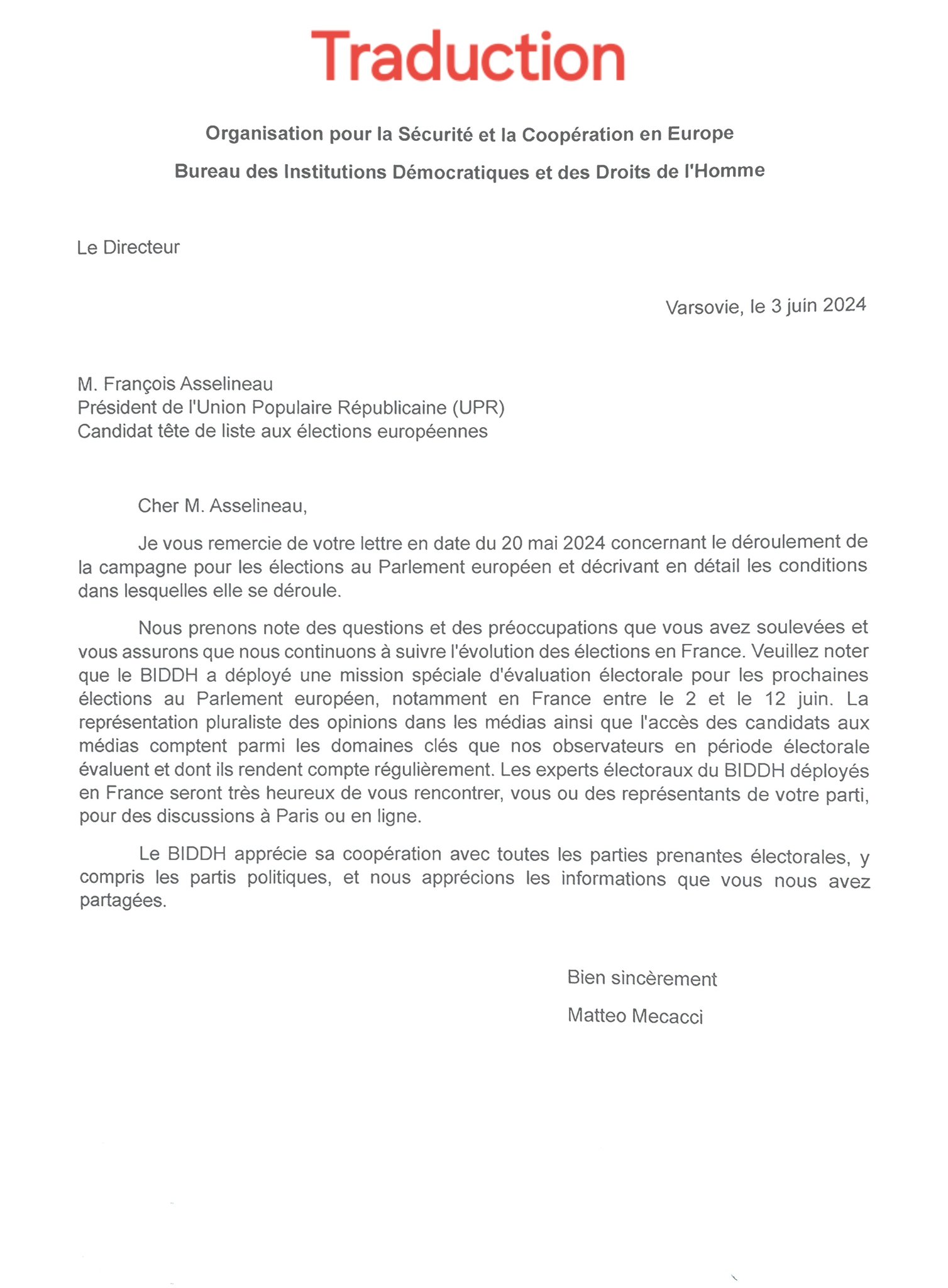 Suite à ma lettre du 20 mai à l’OSCE, j’ai reçu cette réponse positive de M. Mecacci, Directeur du Bureau des Institutions Démocratiques et des Droits de l’Homme ⤵️
