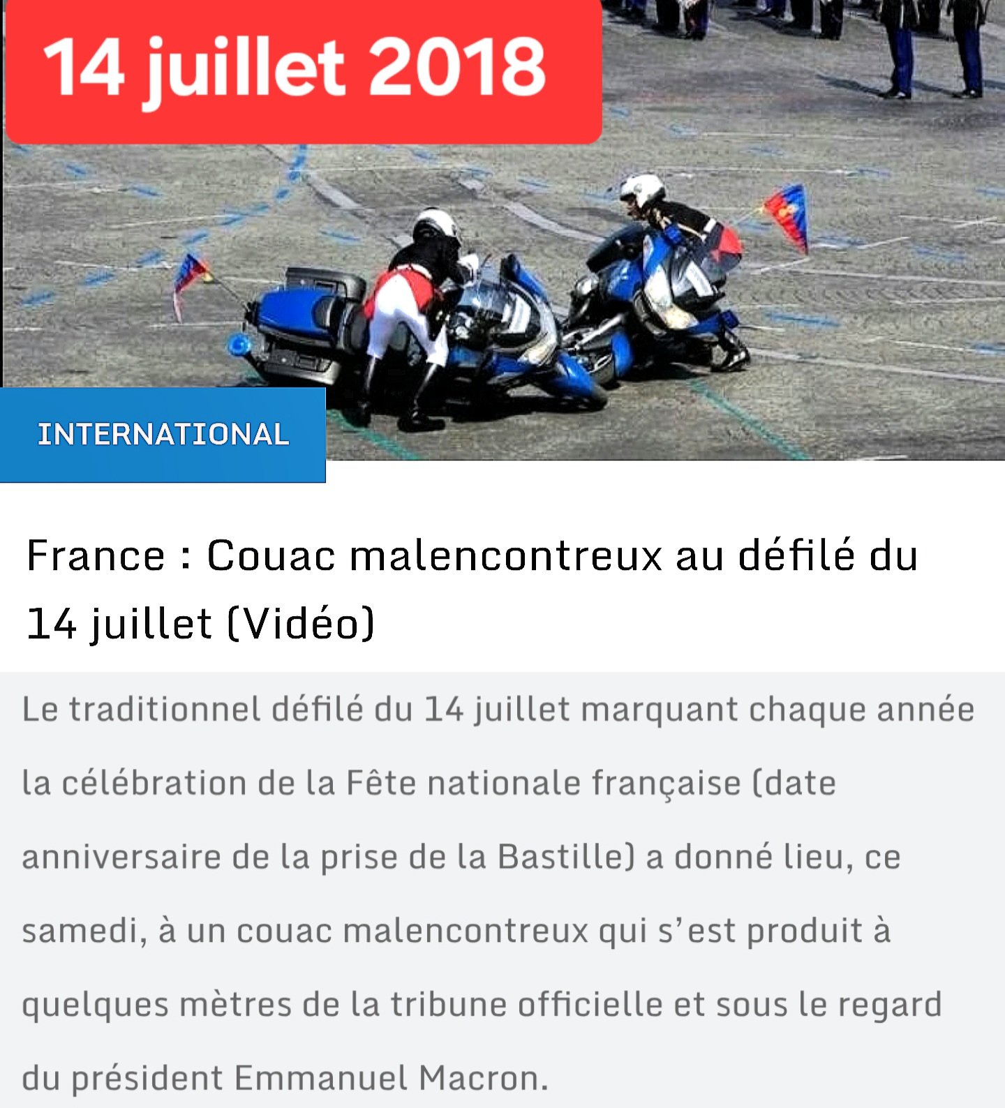 Le 1er « couac » fut l’accident de deux gendarmes à moto, qui se heurtèrent de plein fouet puis tombèrent l’un et l’autre sur la chaussée de la Place de la Concorde. Le tout devant les caméras, sous les yeux et à quelques mètres de Macron et de la tribune officielle. (Photo ci-jointe à gauche)