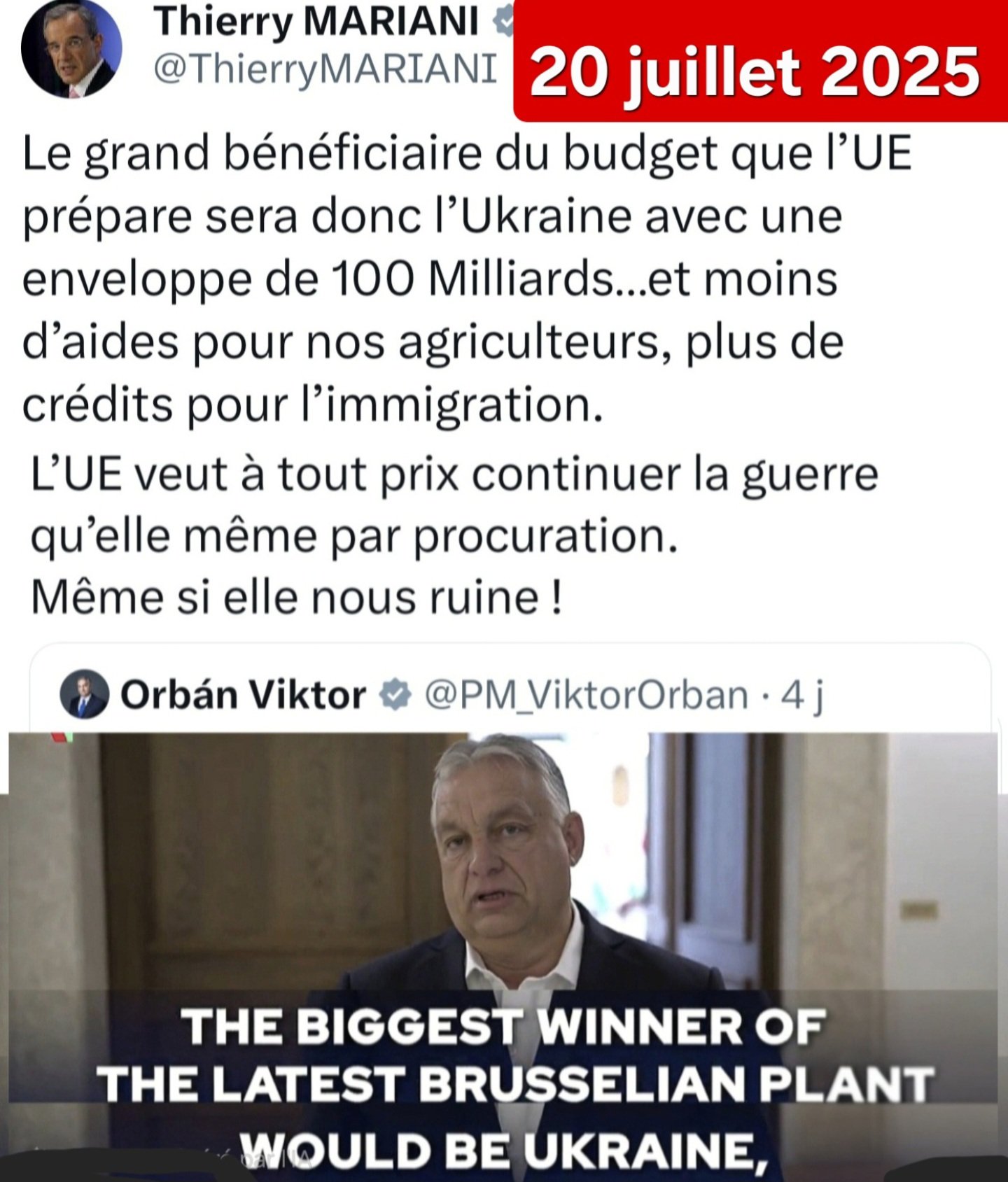 1️⃣il dénonce l’UE qui « veut la guerre et nous ruine », en relayant ce 20 juillet un tweet alarmant du PM hongrois