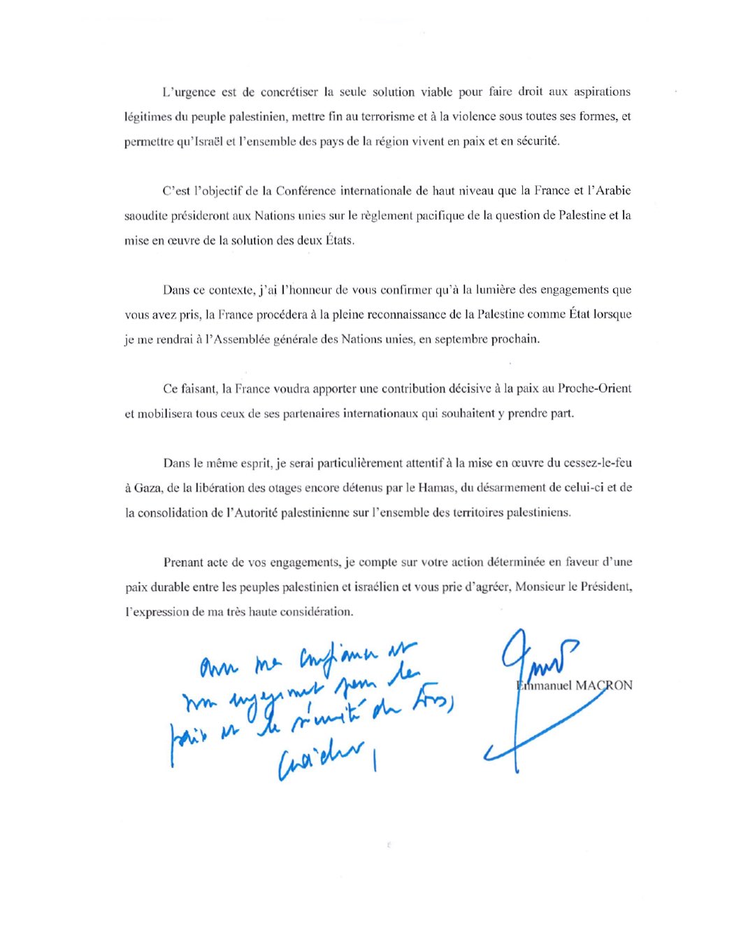 Macron vient d’écrire à M. Abbas que la France reconnaîtra officiellement l’État de Palestine lors de l’Assemblée de l’ONU en septembre.