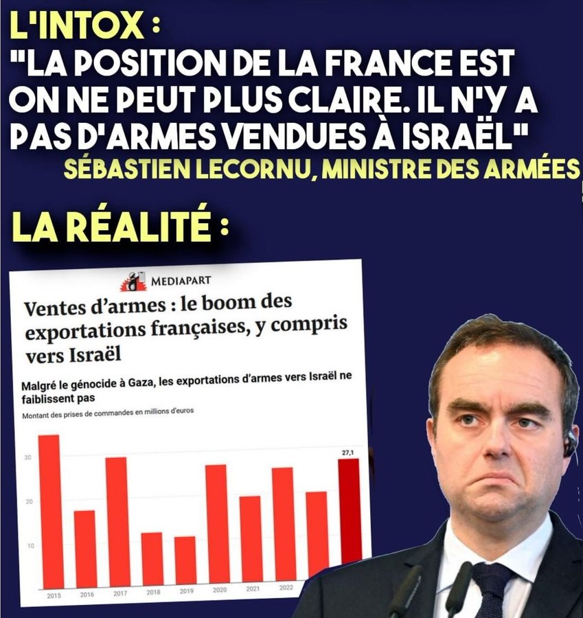 ▪️Alors que le débat sur la perpétuation d’un génocide à Gaza par les troupes israéliennes faisait rage en France et dans le monde, Sébastien Lecornu, ministre des Armées, a déclaré sur LCI le 6 juin dernier : « La position de la France est on ne peut plus claire. Il n’y a pas d’armes vendues à Israël. Et pour cause, Israël est un des principaux concurrents des industries françaises ».